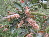 主要為害葉片,也能為害嫩枝、幼果和果柄 。葉片初患病正面出現(xiàn)油亮的橘紅色小斑點,逐漸擴(kuò)大,形成圓形橙黃色的病斑,邊緣紅色。發(fā)病嚴(yán)重時,一張葉片出現(xiàn)幾十個病斑。發(fā)病1~2周后,病斑表面密生鮮黃色細(xì)小點粒,初為桔黃色,后變?yōu)楹谏。病斑背面隆起,叢生淺黃色毛狀物。果實受害,初生黃色小點,后變褐色,病斑四周有與葉背相同的毛狀物。