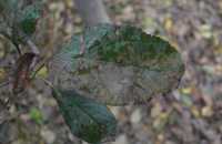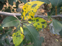 不同蘋果品種的感病性有明顯差異。高溫多雨,當(dāng)氣溫在10-20℃,光照較強,癥狀較重。樹勢衰弱時,癥狀較重,幼樹比成株易發(fā)病。土壤干旱,水肥不足時發(fā)病重。
