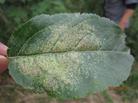 病菌在檜柏上為害小枝,即以茵絲體在菌癭中越冬。第二年春天形成褐色的冬孢子角。冬孢子柄被有膠質(zhì),遇降雨或空氣極潮濕的胺化膨大,冬孢子萌發(fā)產(chǎn)生大量擔(dān)孢子,隨風(fēng)傳播到蘋果樹上。銹菌侵染蘋果樹葉片、葉柄、果實及當(dāng)年新梢等,發(fā)病期持續(xù)一個月。