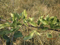 主要為害嫩枝、葉片、新梢,也為害花及幼果。病部滿布白粉是此病的主要特征。幼苗被害,葉片及嫩莖上產(chǎn)生灰白色斑塊,發(fā)病嚴(yán)重時葉片萎縮、卷曲、變褐、枯死,后期病部長出密集的小黑點。大樹被害,芽干癟尖瘦,春季發(fā)芽晚,節(jié)間短,病葉狹長,質(zhì)硬而脆,葉緣上卷,直立不伸展,新梢滿覆白粉。生長期健葉被害則凹凸不平,葉綠素濃淡不勻,病葉皺縮扭曲,甚至枯死。