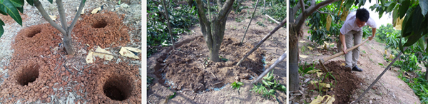 為了促進(jìn)芒果根系正常生長和再生,在不同時(shí)期應(yīng)對(duì)果園做深耕和翻土處理。冬季(或采果修剪后)應(yīng)結(jié)合深翻改土,沿樹冠垂直線下挖(60cm深、30cm寬)環(huán)溝、對(duì)溝或圓形溝,切斷土壤下層的粗根,經(jīng)曬五、六天,然后施采果肥,用表土和植物殘?bào)w加以回填。結(jié)合清園,進(jìn)行中耕翻土(20cm深),以切斷表土的吸收根,減弱地下部分對(duì)地上部分水分和養(yǎng)分輸送,有利地上部分營養(yǎng)物質(zhì)積累,促進(jìn)花芽分化。