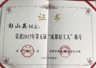 公司研發部彭山英榮獲2017年第五屆“成都好工人”稱號
