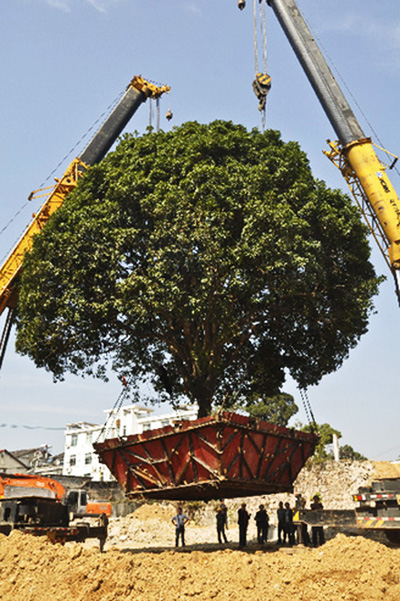 20名作業(yè)人員,連續(xù)一周的緊張工作,40余萬元搬家費(fèi)用。2014年10月23日上午12時(shí)10分,在兩臺(tái)大型起重機(jī)巨臂的牽引下,總重達(dá)62噸的“桂花王”連同底部的箱梁緩緩落入預(yù)定的坑穴,岳西縣城居民廣泛關(guān)注的“桂花王”順利移動(dòng)60余米,成功入住新家。