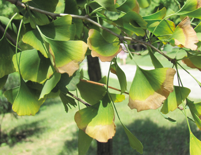 近年來,該銀杏樹出現(xiàn)樹勢衰弱的情況,銀杏葉片小,甚至部分枝條不發(fā)葉的情況,較多老葉邊緣出現(xiàn)焦枯的現(xiàn)象;林業(yè)部門立即聯(lián)系國光名木古樹救護(hù)人員,邀請技術(shù)員到現(xiàn)場對古銀杏進(jìn)行診斷。通過現(xiàn)場檢測發(fā)現(xiàn)古銀杏根部的土壤通透性差,土壤PH值偏堿,土壤中有機質(zhì)缺乏;挖開根部的土壤,觀察發(fā)現(xiàn),古銀杏根系有腐爛的情況,根部土壤水分含量較高;較多葉片出現(xiàn)邊緣焦枯的現(xiàn)象(圖1)。